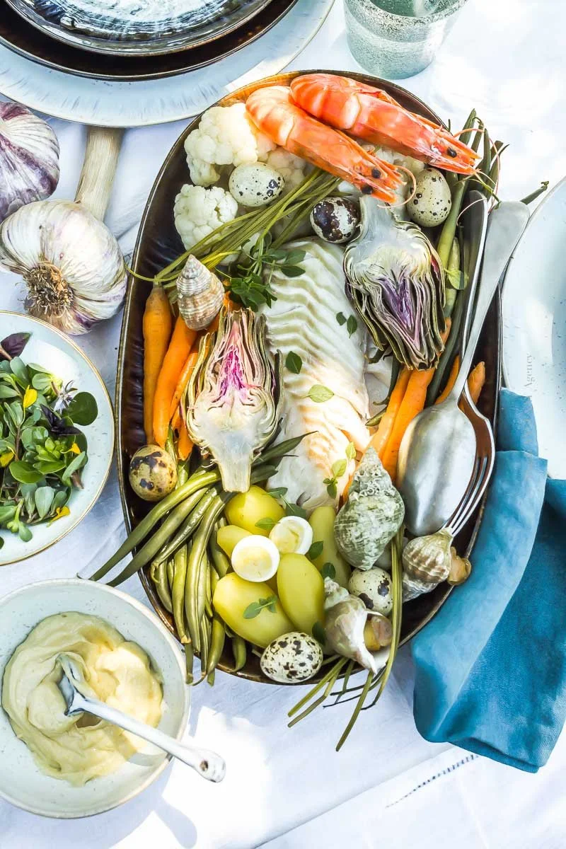 Also note that ‘aïoli’ can refer to an entire meal which includes the sauce and whatever you choose to eat with it. In Provence, a traditional aïoli garni comes with a selection of boiled vegetables (we do potatoes, carrots and cauliflowers in my family), cod/white fish, prawns, hard-boiled eggs and even escargots.